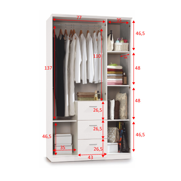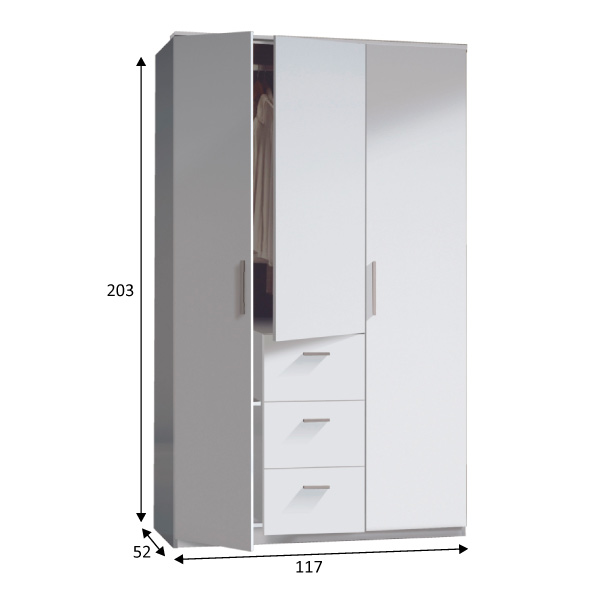 Armario de 3 puertas con barra de colgar y 4 estantes en su interior y 3 cajones en parte central. Práctico, bonito y funcional. Disponible en blanco brillo. ENVÍO GRATIS