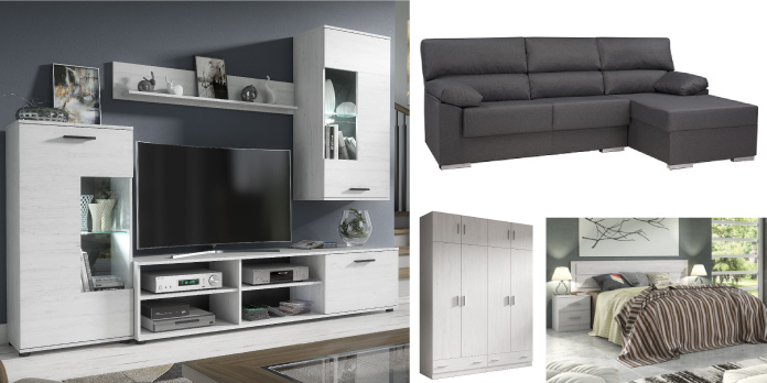 Y por último están los lotes más completos, que también incluyen la tapicería. El lote completo “Plus” es todo un acierto, con muebles sencillos y muy prácticos. Incluye el mueble de salón, el sofá de 3 plazas,  la mesa, 4 sillas, el cabecero y las dos mesitas de noche por mucho menos de lo que imaginas.