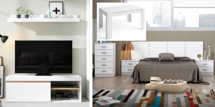 Lo mismo ocurre con el lote “Nórdico” con la combinación de colores estrella,  madera y blanco, un éxito asegurado. Este modelo incluye mueble de salón, mesa de centro, cabecero, dos mesitas de noche y un armario.