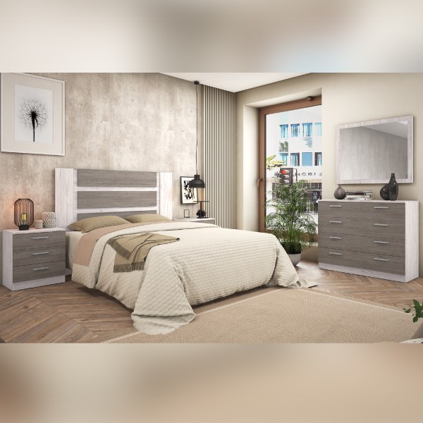 Dormitorio modelo Turín 10 sencillo y moderno. Compuesto por un cabecero alistonado, dos mesitas de noche, una cómoda y espejo marco. Disponible en varias combinaciones de colores