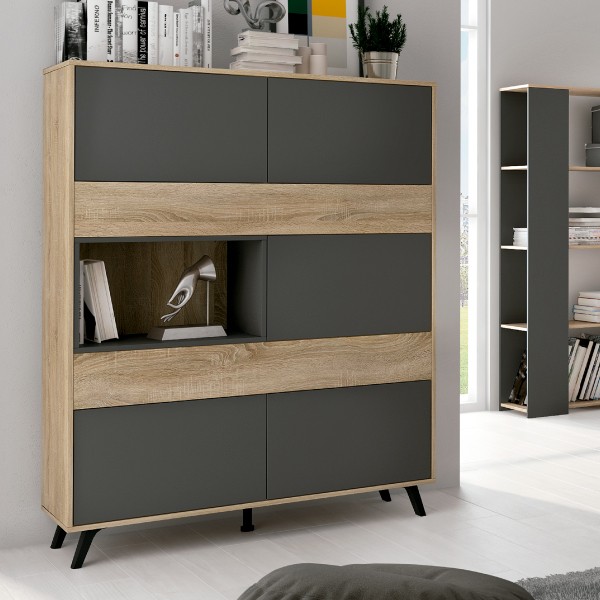 Estantería de la serie Soto. Un diseño asimétrico pero armonioso. Disponible en blanco - roble. Podrás colocar tus libros, vinilos, plantas, etc. Tipo KIT.