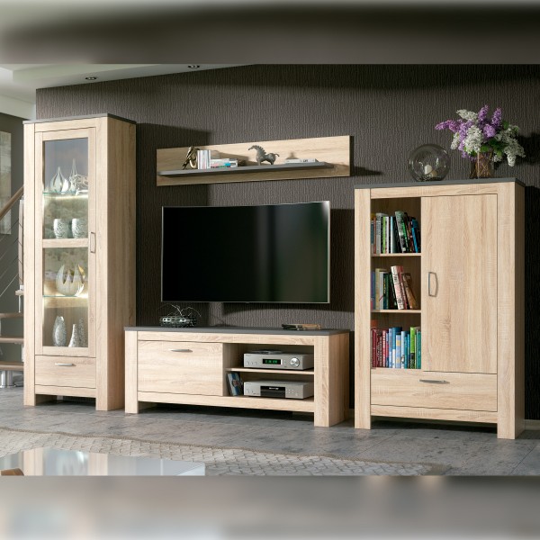 Composición de salón de 220cm. modelo Lucia. Disponible en blanco. La composición esta compuesta por un bajo TV de 220cm., dos vitrinas de colgar y un estante. La foto muestra un ejemplo de como puede ser montada pero el cliente puede colocarla a su gusto ya que los módulos son totalmente independientes.